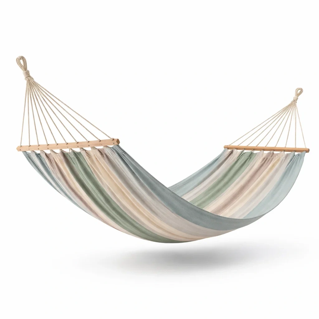 Amaca con tessuto in 100% cotone a righe multicolore, dotata di barre in legno per un sostegno stabile. Il tessuto traspirante offre una confortevole esperienza di relax all'esterno.